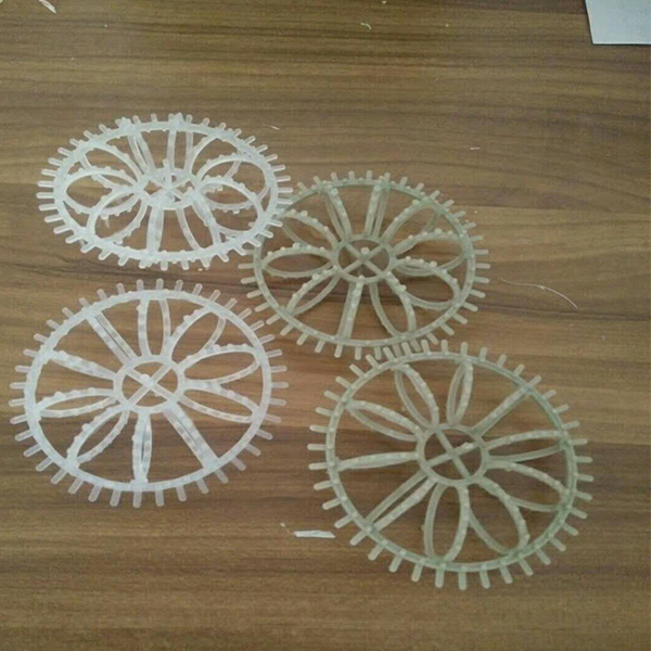 其結構是將塑(sù)料圓片壓扣改成雙圈大塑料環,將醛化纖維或(huò)滌綸絲壓在環的環圈上,使(shǐ)纖維束(shù)均勻(yún)分(fèn)布;內圈是雪花狀塑料枝條,既能掛膜,又(yòu)能有(yǒu)效切割(gē)氣泡,提高氧的轉移速率和利(lì)用率。使水氣生物(wù)膜得到充分交換,使水中的(de)有機物得到高效處理。