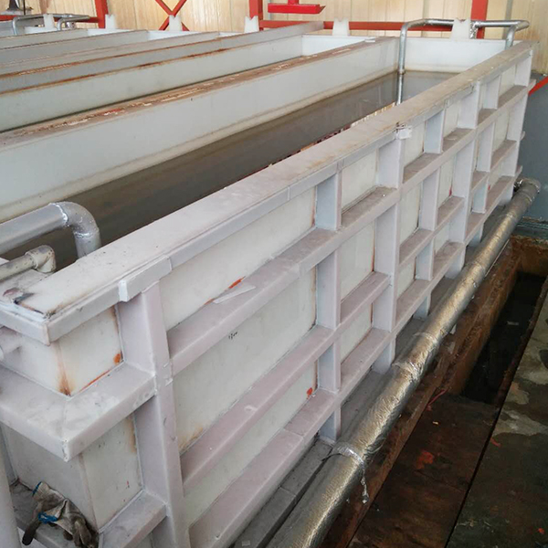 PP水箱液體的加工采(cǎi)用(yòng)采用塑(sù)料王毛細管換熱(rè)器,加熱熱源大於85攝氏度的熱水(shuǐ)(熱(rè)水則由蒸汽加溫)。塑料王毛(máo)細管換熱器豎直放置於酸洗槽內壁側,將熱水打入換熱器的毛細管內,在管壁傳導的作用下,迅速平穩地加熱酸洗液,冷卻後的(de)冷凝水從(cóng)毛細(xì)管內導出酸洗槽(cáo)體。